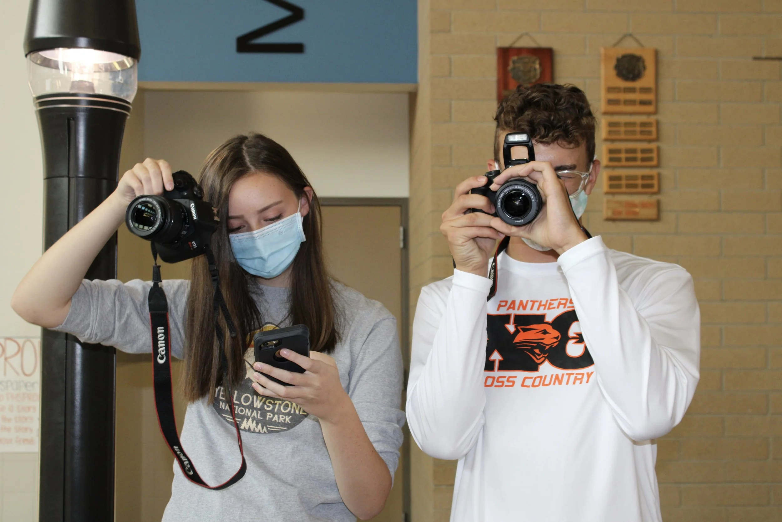 PHS Prowl Editor-in-Chief Abigail Landwehr and reporter Ben Whitlock hold up cameras at Powell High School on Sept. 18, 2020.